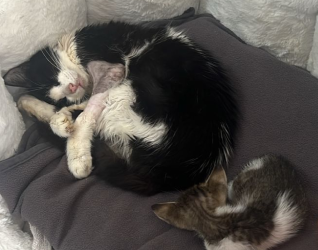Laila weighed just 1.7kg when she was found, she was emaciated, skin and bone and she gave all she had to her babies. Laila was traumatized, weak and quiet, didn’t groom herself and x-rays discovered metal pins surgically implanted in her front legs along with nylon thread left inside from the surgery. She had been put back on the street, in agony and suffering in silence.